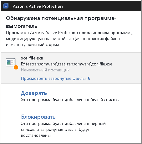 Когда служба Acronis Active Protection включена, она отслеживает процессы, запущенные на компьютере, в режиме реального времени. Обнаружив сторонний процесс, который пытается зашифровать файлы или использовать ресурсы компьютера для криптомайнинга, служба уведомляет пользователя и предлагает разрешить или заблокировать процесс.