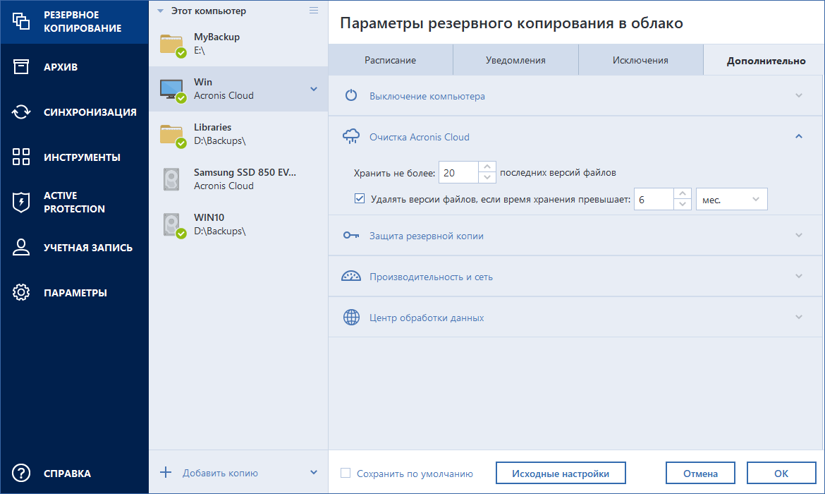 Настройте параметры очистки Acronis Cloud, чтобы оптимизировать использование его пространства.
