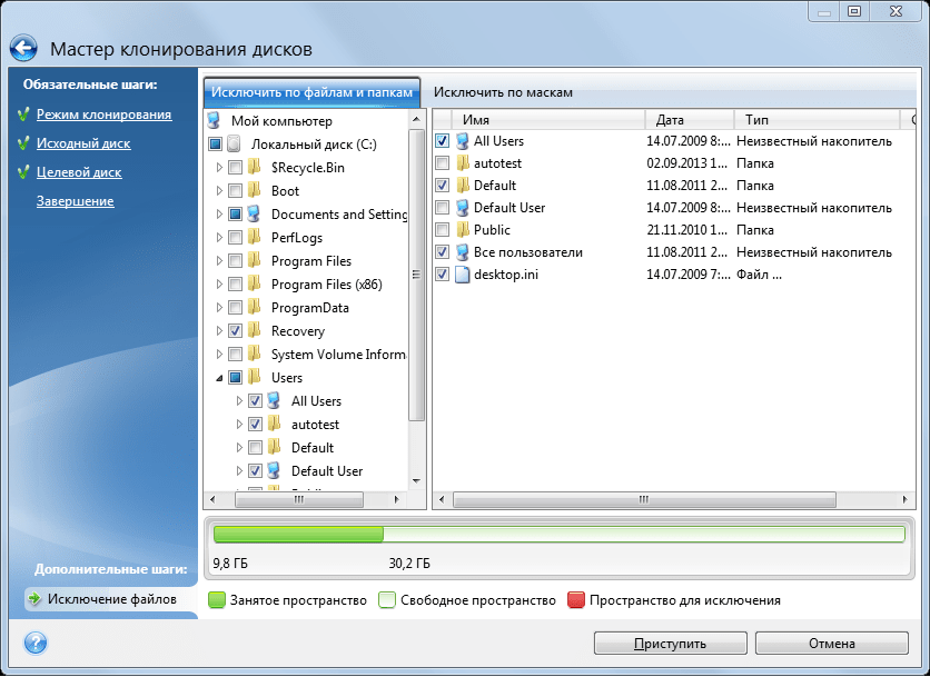 Чтобы не выполнять клонирование определенных файлов с исходного диска (например, когда размер целевого диска меньше исходного), можно исключить их на шаге Исключение файлов.
