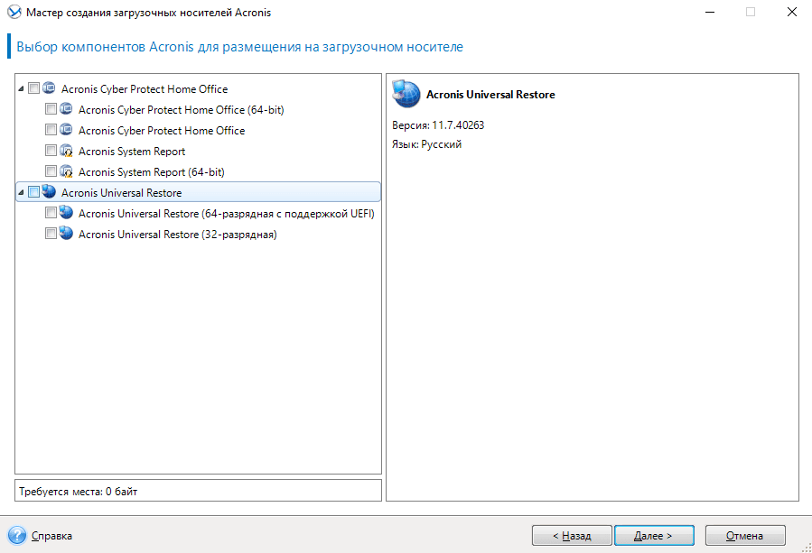 Если программа Acronis Cyber Protect Home Office установлена на компьютере, ее можно также поместить на носитель. В этом случае у вас будет единый загрузочный носитель, содержащий оба компонента, необходимых для восстановления на отличающемся оборудовании.