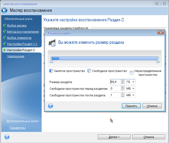 - Размер — в области «Размер раздела» щелкните Изменить настройки по умолчанию. По умолчанию раздел будет занимать весь новый диск. Введите правильное значение в поле «Размер раздела» (это значение показывается на шаге Объект восстановления). При необходимости перетащите раздел в расположение, которое было показано в окне «Информация о резервной копии». Нажмите кнопку Принять.