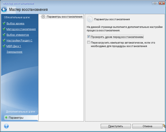 Чтобы автоматически проверить резервную копию перед восстановлением, на шаге Параметры мастера восстановления установите флажок Проверять архив резервных копий перед восстановлением.