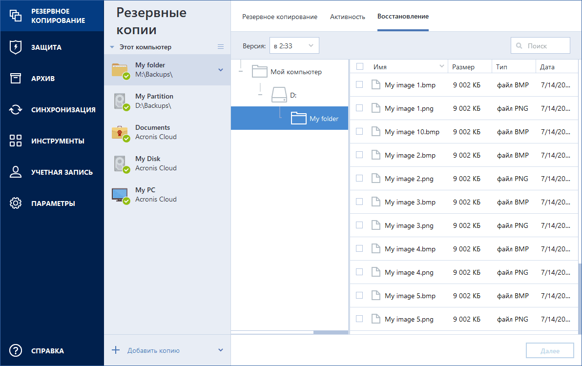 В списке Версия резервной копии выберите нужную версию по дате и времени создания резервной копии.