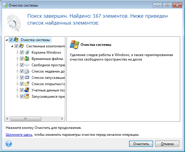 Мастер очистки системы позволяет гарантированно удалять все следы работы на компьютере, включая имена пользователей, пароли и другие личные сведения.
