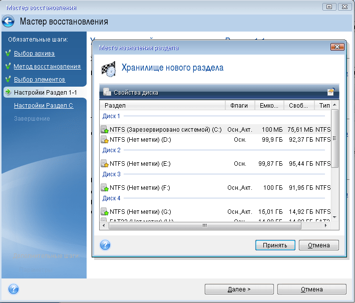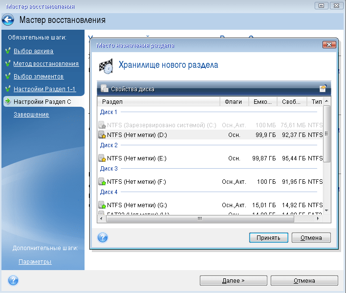 После выбора разделов появятся соответствующие шаги Настройки раздела. Данные шаги начинаются с разделов, которым не присвоены буквы дисков (обычно скрытые разделы относятся к этой категории). Затем разделы указываются в восходящем порядке букв дисков, присвоенных разделам. Этот порядок нельзя изменить. Порядок отображения разделов в программе не обязательно совпадает с физическим порядком расположения разделов на жестком диске.