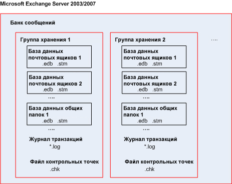 В Exchange 2003/2007 группа хранения — это логический контейнер для баз данных Exchange, связанных файлов журнала транзакций, файлов контрольных точек и других системных файлов. Все базы данных в группе хранения объединены одним потоком журнала. Группа хранения является базовой единицей для резервного копирования и восстановления.