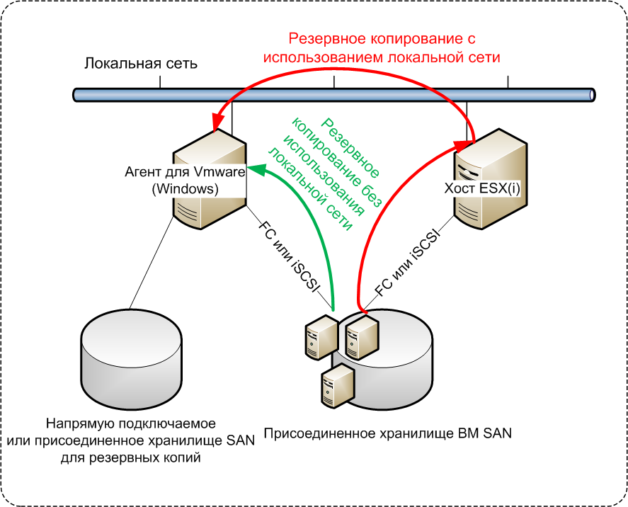 Если ESX(i) использует подключенное хранилище SAN, установите агент на машину, подключенную к той же сети SAN. Агент будет создавать резервные копии виртуальных машин прямо из хранилища, а не через хост ESX(i) и локальную сеть. Эта возможность называется резервным копированием без использования локальной сети.