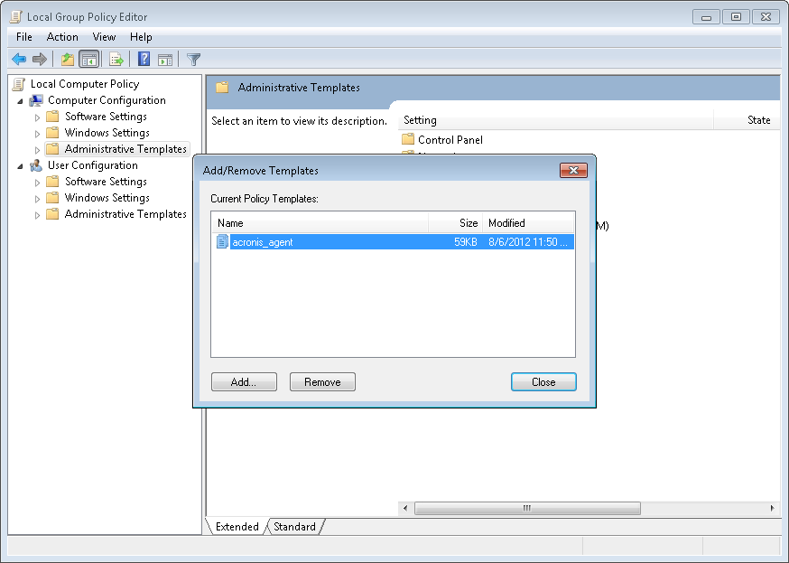 Административный шаблон, предоставляемый Acronis, позволяет выполнять точную настройку некоторых функций обеспечения безопасности, включая параметры зашифрованного обмена данными. Посредством механизма групповой политики Майкрософт можно применять параметры политики шаблонов к одному компьютеру или к домену.