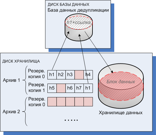 В результате хранилище данных содержит некоторое количество уникальных блоков данных. На каждый блок указывает одна или несколько ссылок из резервных копий. Эти ссылки хранятся в базе данных дедупликации. Резервные копии остаются без изменений. Они содержат хэш-значения и данные, которые не удалось дедуплицировать.
