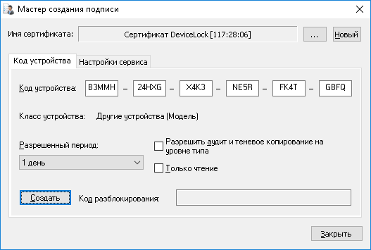 4. Нажать кнопку Создать, чтобы создать код разблокирования. Передайте этот код пользователю по телефону или любым другим способом.