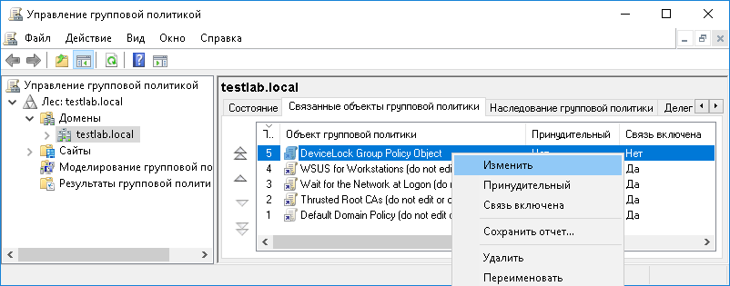 3. На вкладке Связанные объекты групповой политики на панели сведений щелкните правой кнопкой мыши нужный объект групповой политики и выберите команду Изменить.
