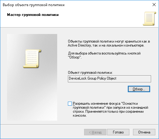 4. Нажмите кнопку Обзор, чтобы выбрать нужный объект групповой политики из домена Active Directory, затем нажмите кнопку Готово.
