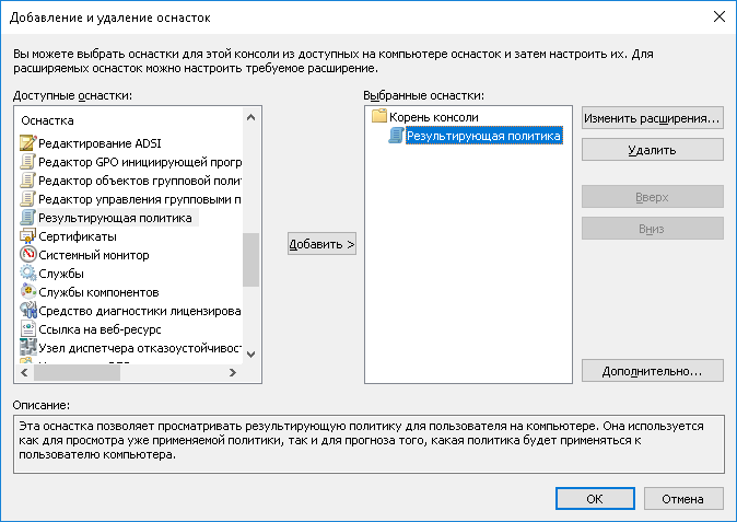 3. В появившемся диалоговом окне выберите из списка оснастку Результирующая политика и нажмите кнопку Добавить.
