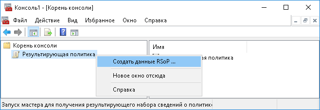5. В дереве консоли щелкните правой кнопкой мыши элемент Результирующая политика и выберите команду Создать данные RSoP в контекстном меню.
