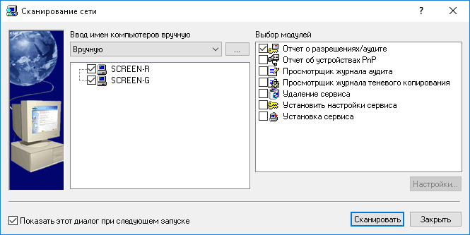Диалоговое окно Сканирование сети обеспечивает возможность выбора компьютеров в локальной сети и выполнения действий (установка или удаление агента, установка разрешений, правил аудита и т.п.), которые должны быть выполнены для этих компьютеров.