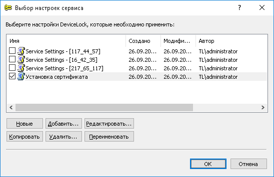 Модуль Установить настройки сервиса считывает политику (настройки, разрешения, аудит, правила теневого копирования и оповещений) из внешнего файла настроек и устанавливает ее для сервиса DeviceLock на клиентских компьютерах в сети.