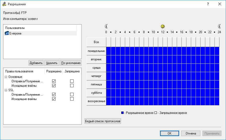 В правой части диалогового окна “Разрешения” можно указать дни недели и время, когда будет предоставлен доступ к выбранным протоколам. Используйте левую кнопку мыши, чтобы выбрать дни недели и время, когда выбранному пользователю или группе будет предоставлен доступ к выбранным протоколам. Используйте правую кнопку мыши, чтобы отметить дни недели и время, когда доступ будет запрещен.