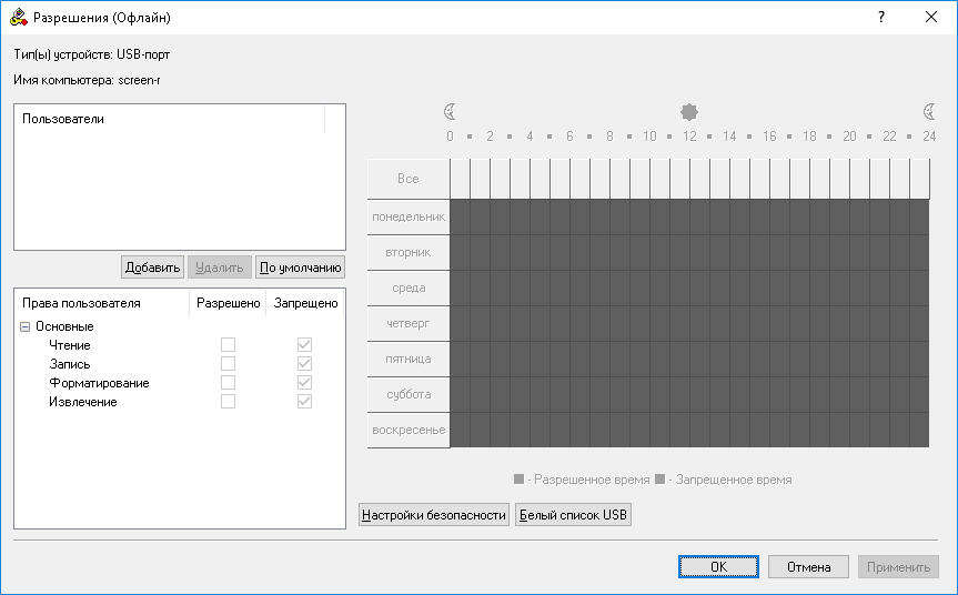 В правой части диалогового окна “Разрешения (Офлайн)” можно указать дни недели и время, когда будет предоставлен доступ к устройствам. Используйте левую кнопку мыши, чтобы выбрать дни недели и время, когда выбранному пользователю или группе будет предоставлен доступ к устройствам. Используйте правую кнопку мыши, чтобы отметить дни недели и время, когда доступ будет запрещен.