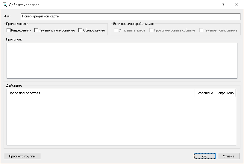 •Разрешениям, Теневому копированию, Обнаружению - Указывает, что правило будет применяться как для операций контроля и избирательного теневого копирования, так и для операций обнаружения.