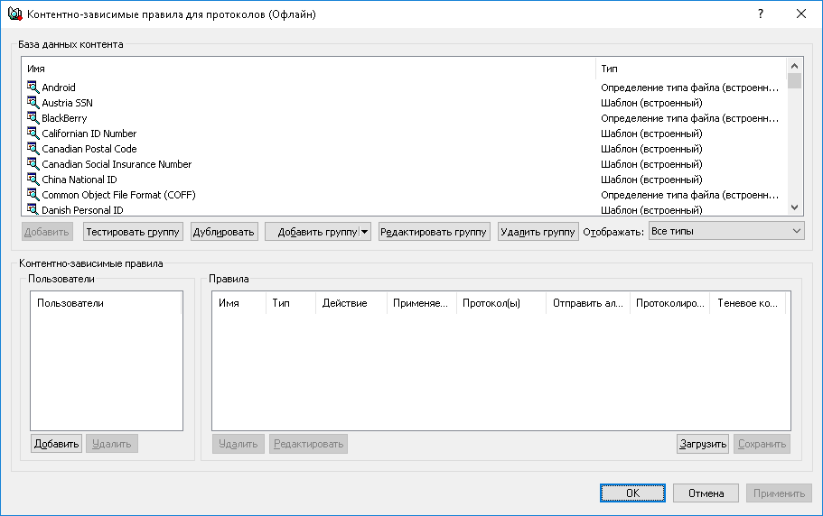 Можно задавать контентно-зависимые правила для разных режимов работы (оперативного и автономного) для одних и тех же пользователей или групп. Для получения информации о том, как задать контентно-зависимые правила для оперативного режима, см. раздел