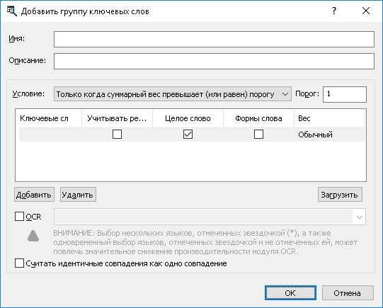 •Вес - Определить степень важности каждого ключевого слова или фразы. Степень важности (вес) используется для подсчета вхождений ключевых слов в тексте. Этот параметр должен быть установлен, если выбрано условие срабатывания Только когда суммарный вес превышает (или равен) порогу.