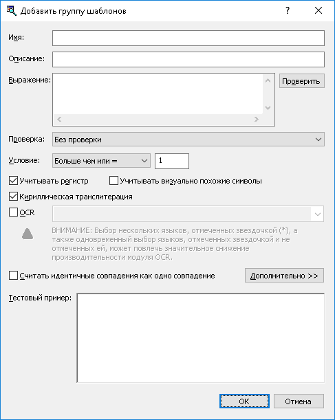 •Кириллическая транслитерация - Если этот флажок установлен, группа распознает кириллический текст, подлежащий обнаружению, независимо от того, написан ли текст кириллицей или латинскими буквами. Например, если слово Серия соответствует данной группе, то ей будет соответствовать также слово Seriya.