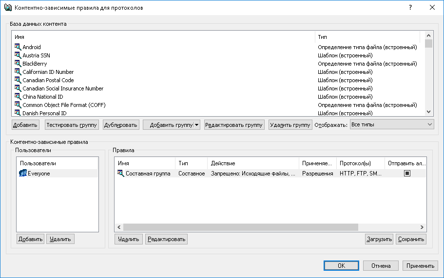 Примечание: Разрешающее правило, основанное на группе, у которой установлен флажок Защищен паролем, имеет приоритет над запрещающими правилами, разрешая передачу любого соответствующего этому правилу контента. Разрешающее правило, основанное на составной группе, будет иметь приоритет в том случае, когда логически связанная цепочка групп, разрешающая данный контент, имеет в своем составе группу, у которой установлен флажок Защищен паролем. |