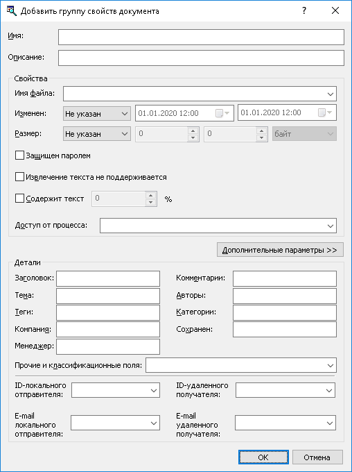•Дополнительные параметры - Позволяют настроить группу для распознавания различных свойств проверяемых документов, таких как встроенные и настраиваемые (пользовательские) свойства документов Microsoft Office и документов других типов, отправителей и получателей мгновенных сообщений и электронных писем, а также метки классификации, применяемые сторонними продуктами, такими как Boldon James Classifier.