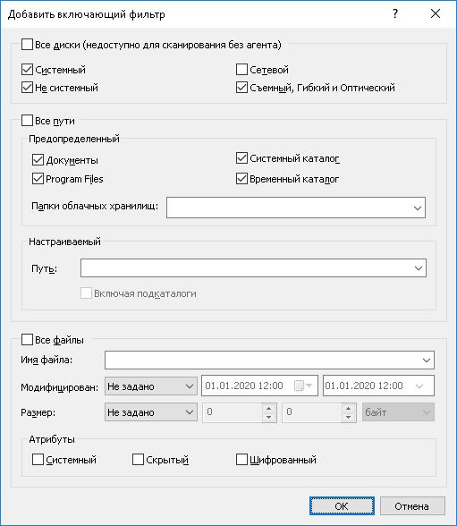 Все диски - Задайте типы дисков для сканирования. Данные параметры не поддерживаются в режиме сканирования без агента, при котором сканируются все диски независимо от их типа.