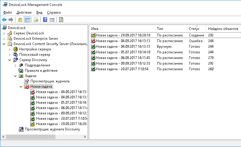 1. В дереве консоли DeviceLock Management Console раскройте узлы DeviceLock Content Security Server > Сервер Discovery > Задачи.