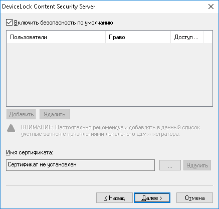 Установка DeviceLock : Установка DeviceLock Content Security Server : Настройка и завершение установки : Администраторы сервера и сертификат