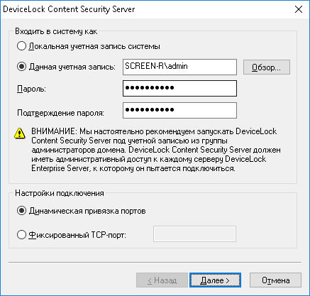 На первой странице мастера настройки задается учетная запись запуска службы DeviceLock Content Security Server и выбирается TCP-порт для подключения к этому серверу.