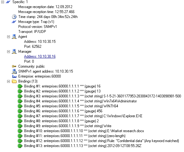 SNMP-уведомление рассылается каждый раз, когда происходит событие, приведшее к тревожному оповещению. Ниже приводится пример SNMP-оповещения.