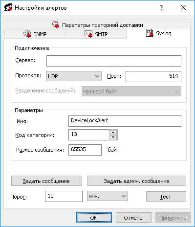 В появившемся диалоговом окне Syslog-сообщение для административных алертов можно также: