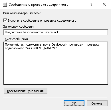 Текст сообщения по умолчанию: “Пожалуйста, подождите, пока DeviceLock производит проверку содержимого "%CONTENT_NAME%".”
