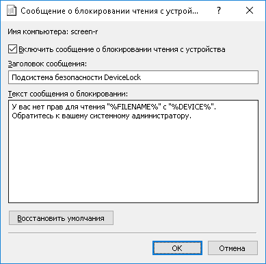 Этот параметр задает сообщение, которое будет показано пользователю при запрете попытки чтения данных с устройств следующих типов: Гибкий диск, Жесткий диск, Оптический привод, Съемные устройства, Ленточные накопители, MTP, iPhone-устройства, Palm, Windows Mobile, ТС-устройства (при запрете на Чтение с подключенного диска, Буфер обмена входящий текст, Буфер обмена входящие изображения, Буфер обмена входящие аудио данные, Буфер обмена входящие файлы или Буфер обмена входящие неизвестные данные).