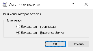 По умолчанию для выбора источника групповых/серверных политик используется неявно заданное значение Любой, при котором будет применена первая полученная политика - групповая либо Enterprise Server, после чего будет автоматически установлен выбор источника политики - Локальная и групповая либо Локальная и Enterprise Server соответственно.