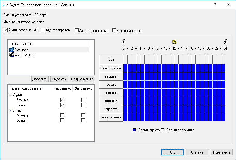 С помощью кнопки По умолчанию можно задать правила аудита и теневого копирования по умолчанию для устройств: члены группы Пользователи (Users) и учетная запись Все (Everyone) имеют права Чтение и Запись на аудит, а права на теневое копирование для них отключены.