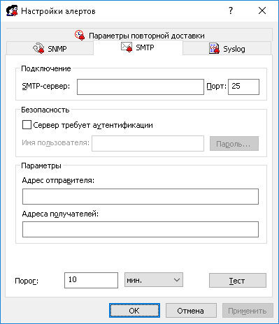 На вкладке SMTP диалогового окна Настройки алертов можно настроить отправку уведомлений по электронной почте.