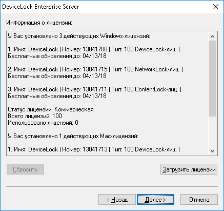 После загрузки файлов можно просмотреть сводную информацию о лицензии: в строке Всего лицензий отображается общее количество приобретенных лицензий, а строка Использовано лицензий содержит количество лицензий, используемых для сбора данных аудита, теневого копирования и мониторинга в DeviceLock Enterprise Server.