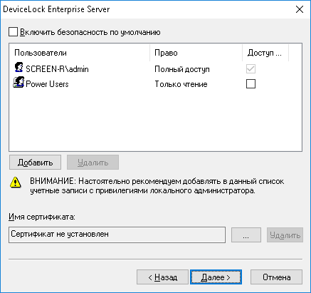 Если требуется более гибкий контроль доступа к DeviceLock Enterprise Server, отключите контроль по умолчанию, сняв флажок Включить безопасность по умолчанию.