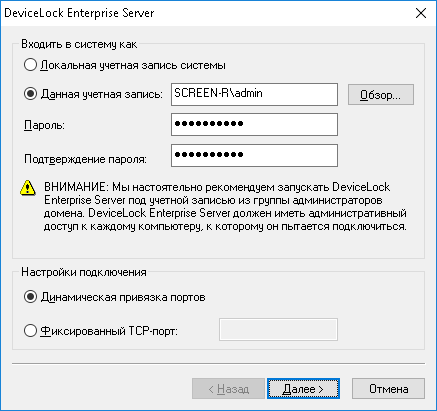 На первой странице мастера настройки задается учетная запись запуска службы DeviceLock Enterprise Server и выбирается TCP-порт для подключения к этому серверу.