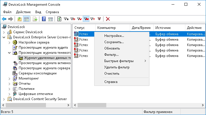 Удаление записи из журнала теневого копирования приводит к удалению теневой копии данных; при этом мета-данные (имя и размер файла, имя пользователя, дата/время и т.п.) сохраняются в журнале удаленных данных теневого копирования.