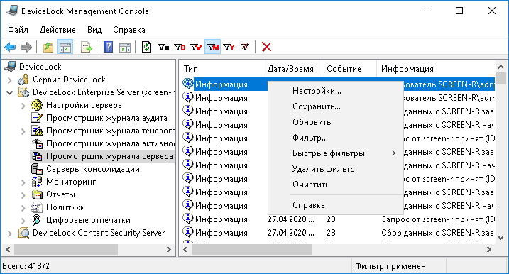 Этот встроенный просмотрщик позволяет получить список записей из внутреннего журнала сервера DeviceLock Enterprise Server. Сервер использует этот журнал, чтобы протоколировать свои собственные события, ошибки и любую другую важную информацию (например, изменения в настройках, запуск и остановку, номер версии и т.п.).