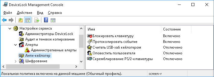 Кейлогеры - это устройства, которые перехватывают и записывают в собственную память все нажатия клавиш на клавиатуре. Сервис DeviceLock обнаруживает USB-кейлогеры и блокирует клавиатуры, подсоединенные к ним. Также сервис DeviceLock может блокировать PS/2-кейлогеры.