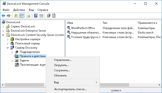 •Загрузить - Импортировать правила из файла. Эта команда позволяет импортировать как правила обнаружения контента сервера Discovery, так и контентно-зависимые правила и контентные группы сервиса DeviceLock.