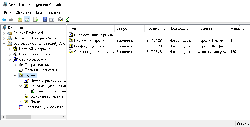 Все задачи, а также связанные с ними журнал и отчеты, доступны в дереве консоли в узле DeviceLock Content Security Server > Сервер Discovery > Задачи.
