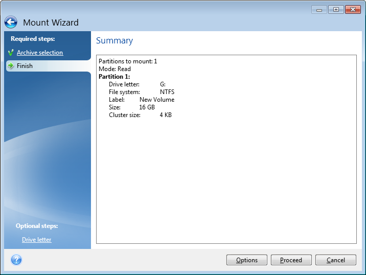Please keep in mind that, though both file backups and disk/partition images have a default ".tib" extension, only images can be mounted. If you want to view file backup contents, use the Explore operation.