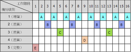 此表格顯示五級備份配置的模式。該模式由 16 個工作階段組成。