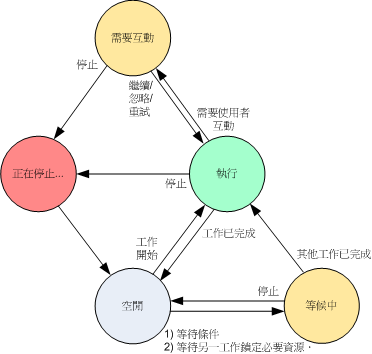 工作可以為下列狀態之一:空閒;等候中;執行中;正在停止;需要互動。初始工作狀態為空閒。